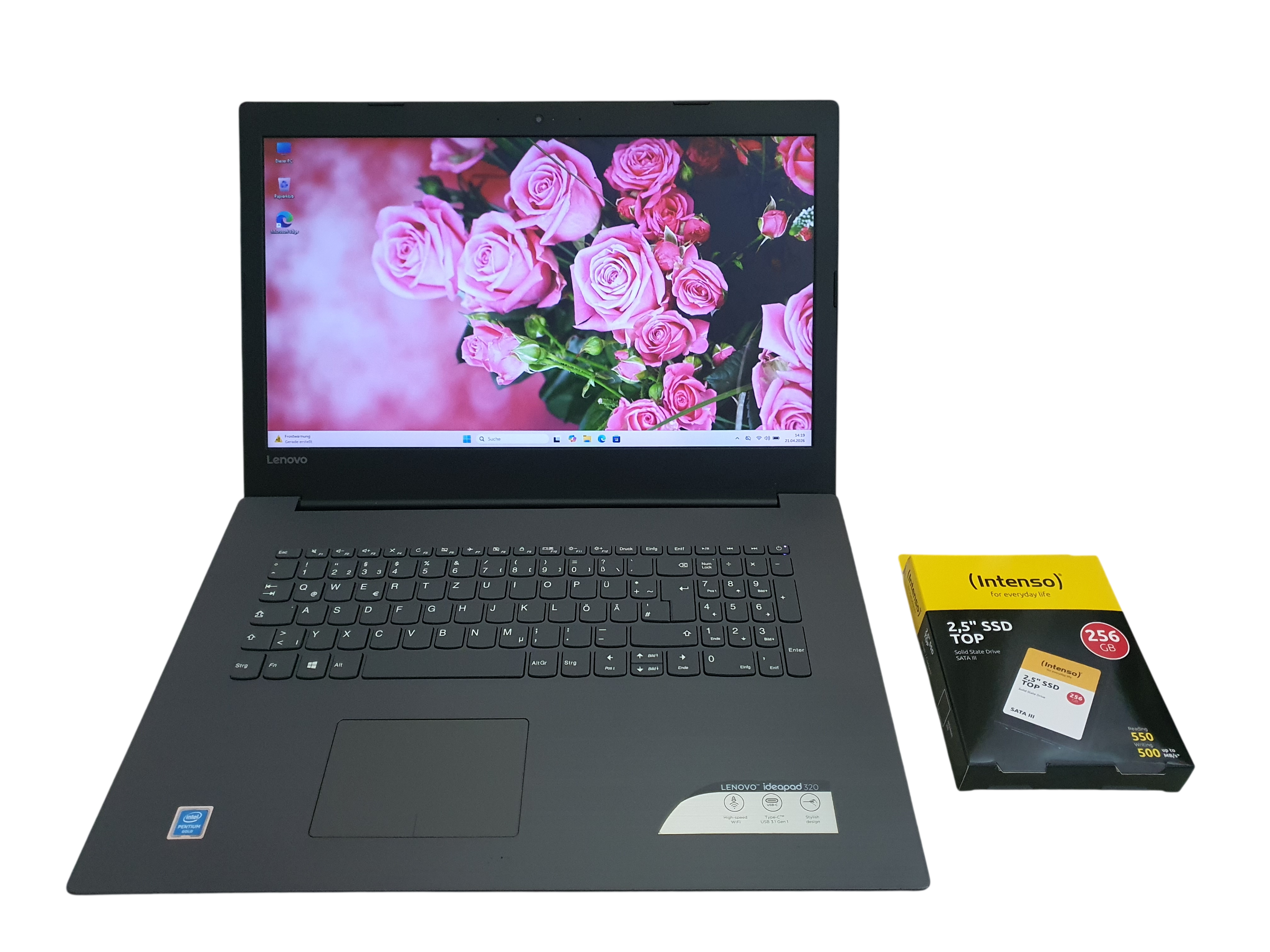 - Festplatte: NEUE 256GB SSD (Marke: Intenso).