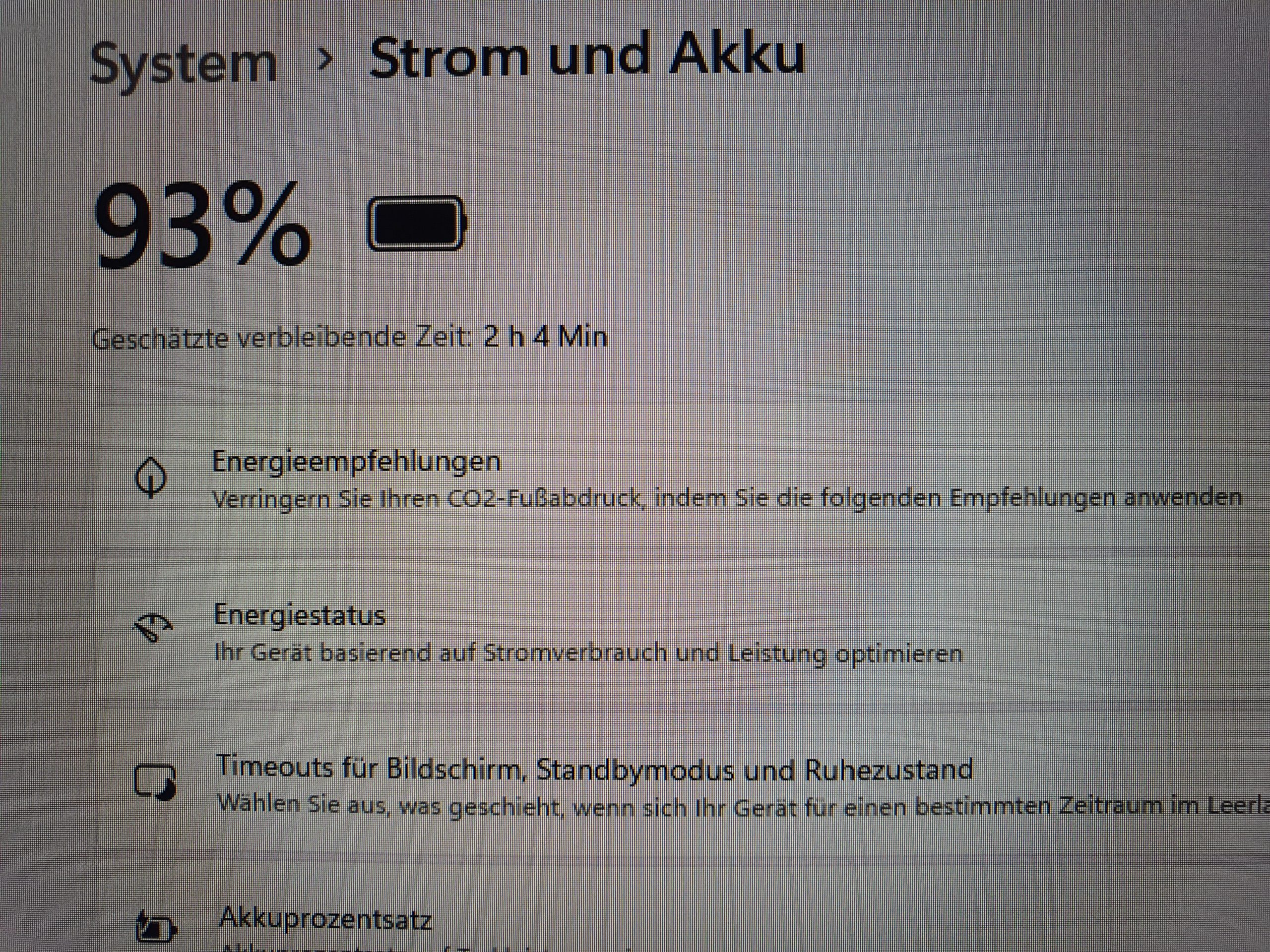 - Akku: Zeigt ca. 2 Std. 04 Min. an (tatsächliche Laufzeit nicht ermittelt)